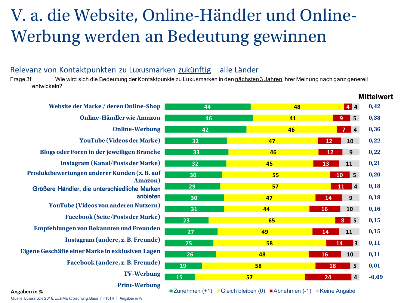 Ein weiteres Ergebnis: Die Bedeutung der einzelnen Kontaktpunkte verändert sich. Der Online-Handel wird eine wichtigere Rolle spielen, Amazon ist kein Tabu mehr. Luxusmarken müssen also lernen, ihre Marke auch an jenen Kontaktpunkten zu steuern, auf die sie nur indirekt Einfluss nehmen können. Hingegen wird der Monobrand-Store in exklusiver Lage – heute noch auf Platz 1 auf der Bedeutungsskala – in den nächsten drei Jahren an Relevanz verlieren und auf Platz 13 fallen.