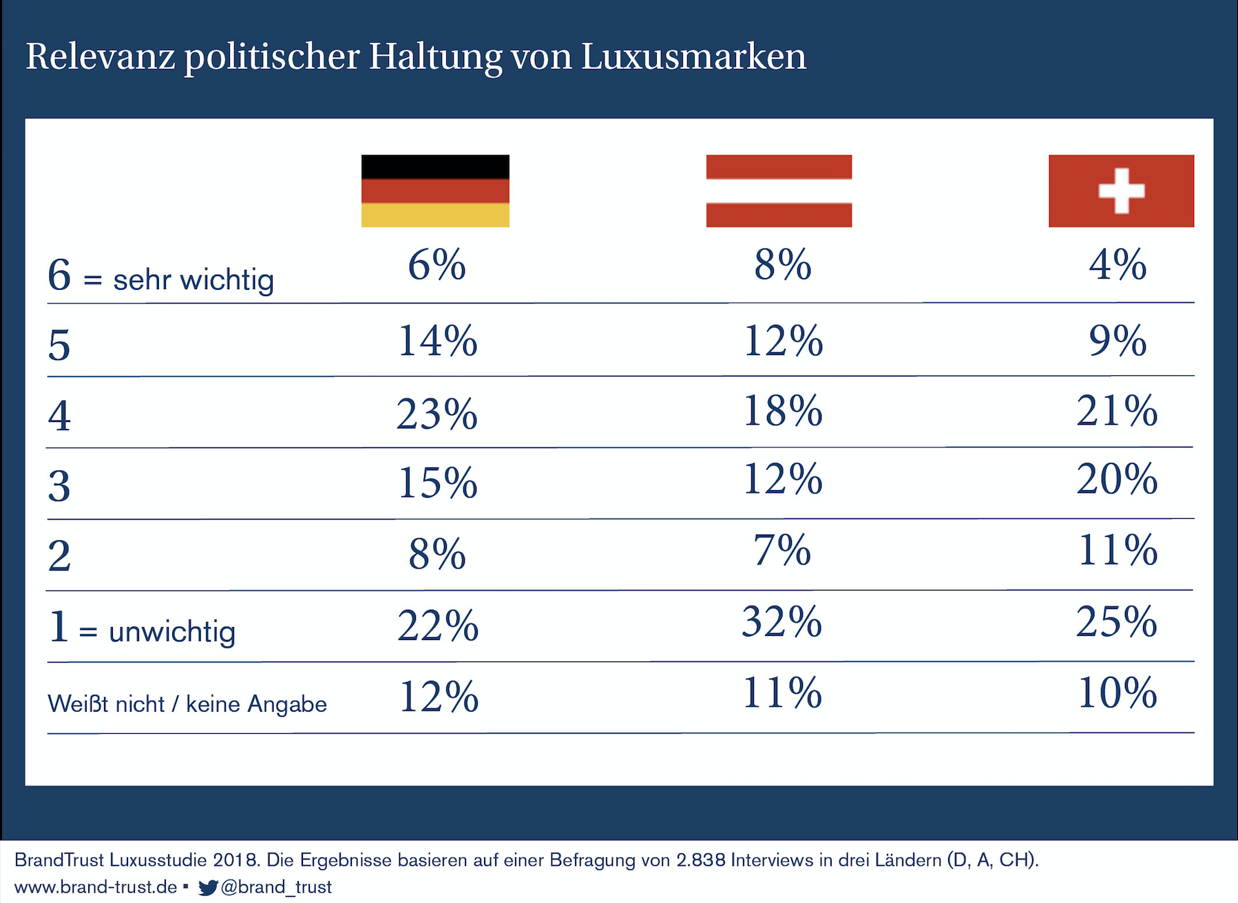 Uns hat interessiert, ob Luxusmarken eine politische Haltung brauchen. Deshalb befragten wir über 2.500 Luxusmarkenkäufer in DACH: Wie wichtig für Präferenz und Kaufentscheidung ist die politische Haltung von Luxusmarken?